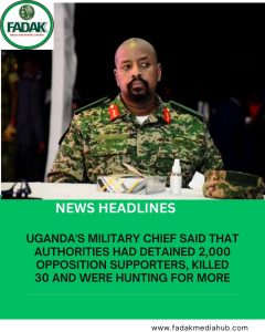 Uganda’s military chief said on Friday that authorities had detained 2,000 opposition supporters, killed 30 and were hunting for more following a disputed presidential election in which his father Yoweri Museveni, won a seventh term. Museveni, 81, who has led the East African nation for nearly four decades, was declared to have resoundingly defeated Bobi Wine, leader of the opposition National Unity Platform (NUP) party in the January 15 vote, held during an internet blackout. Wine, a former musician whose legal name is Robert Kyagulanyi, rejected the election result, alleging widespread irregularities including ballot stuffing, and went into hiding.